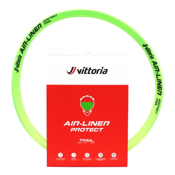 El Air-Liner Light está disponible como un aro superligero (sólo 55 g) y está coloreado en el icónico verde Air-Liner de Vittoria. Es compatible con neumáticos MTB de 29 "x2.1" a 29 "x2.4", con canales de llanta de 25mm a 30mm de ancho y cualquier sellador. Sólo puede utilizarse con neumáticos tubeless y válvulas tubeless reutilizables. El embalaje de la Air-Liner Light contiene un inserto y una válvula Vittoria Green Multiway Tubeless de 40mm de longitud.